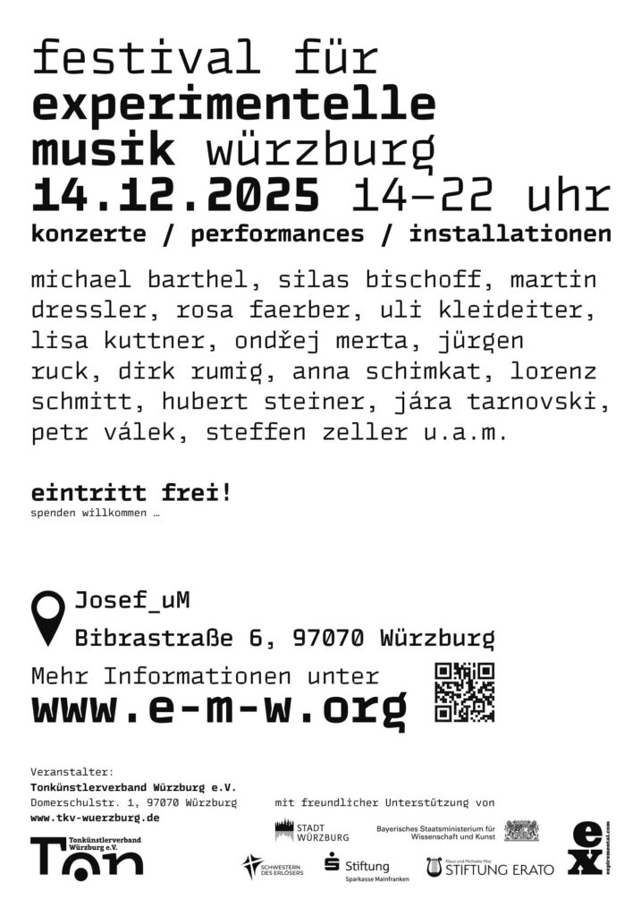 So Steffen Zeller of the Tonkünstlerverband Würzburg and myself are going one step further with organizing the first festival for experimental music here in Würzburg, Germany. It will take place on Sunday, December 14th, 2025, at the same venue. This time with more space(s), more performers, and more sonic adventures both for us and the curious audience we heartly welcome.